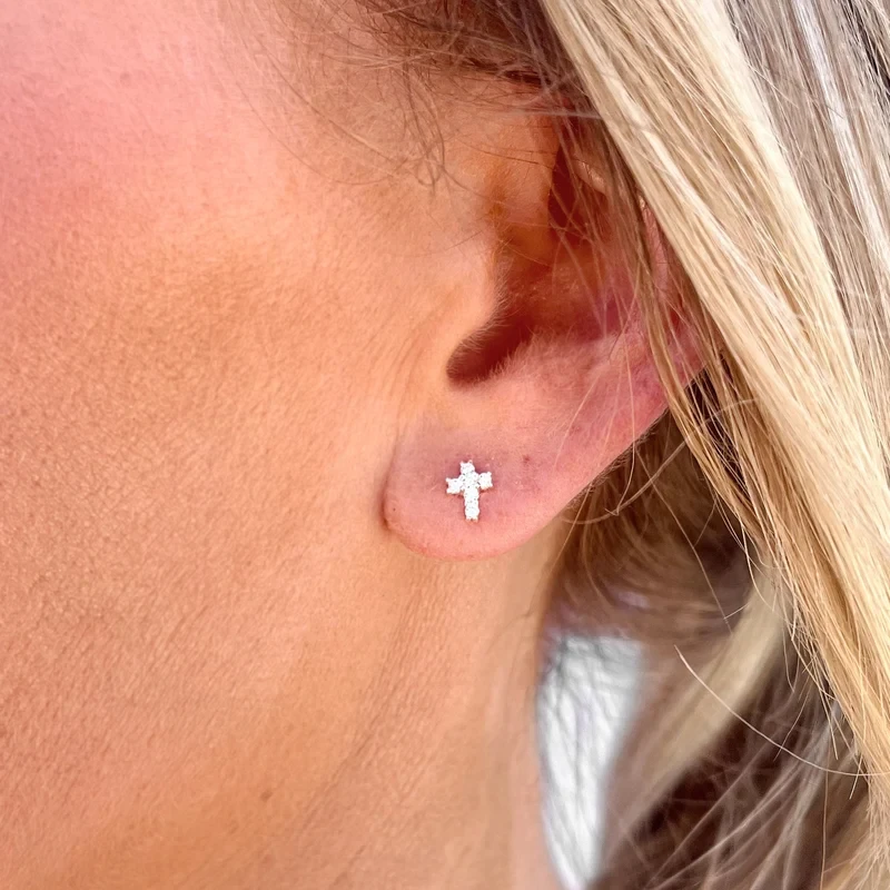 Elegant and meaningful, these delicate stud earrings are crafted from refined gold and shaped into classic crosses. Encrusted with shimmering stones, they offer a subtle sparkle perfect for everyday wear or special occasions. Despite their silver-toned appearance, these earrings are made from high-quality refined gold, combining spiritual symbolism with timeless style. Lightweight and minimalistic, they’re ideal for layering or wearing solo as a statement of faith and fashion.