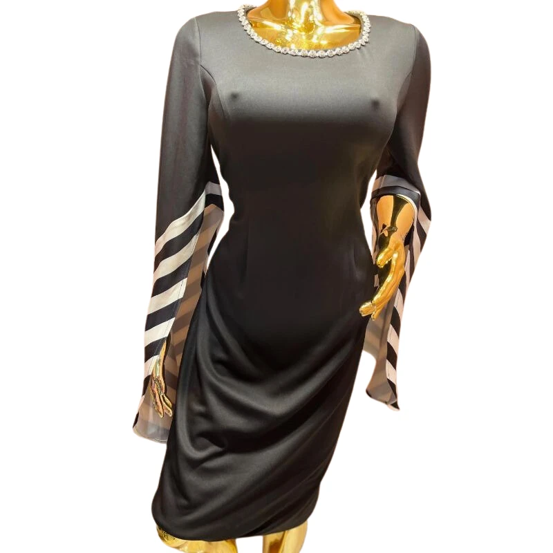 Exude sophistication with this elegant charcoal pencil dress, designed for timeless glamour and versatility. The dress features a flattering knee-length silhouette with dramatic slit bell sleeves in a contrasting striped satin, adding a touch of drama to the sleek, body-hugging fit.