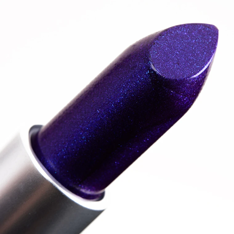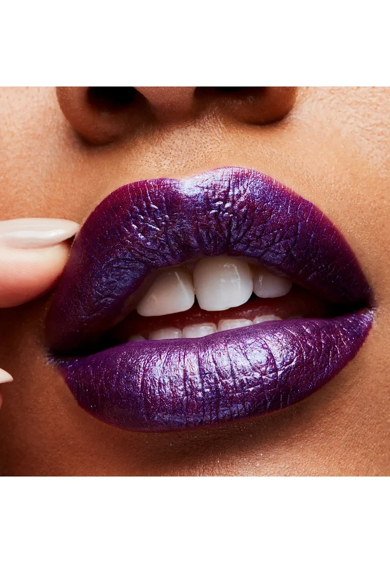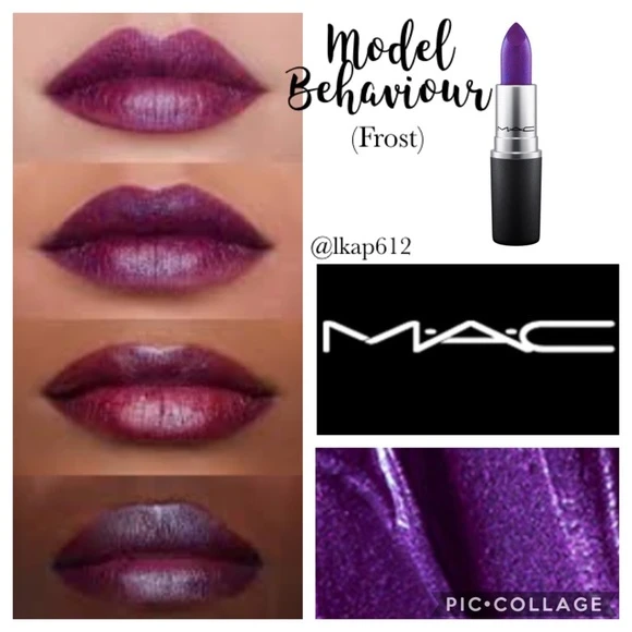 Color Description: "Model Behaviour" is a vibrant, medium-dark magenta-purple with cool, bluish undertones and a frosty, pearlized sheen. It has a fine shimmer that gives lips a luminous finish without being overly glittery.