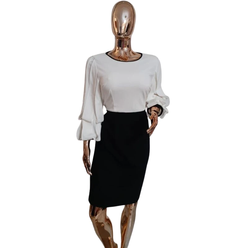 Make a stylish statement with this elegant monochrome shift dress, featuring a contrasting white bodice with a ruffled yoke and sleek black skirt. The dress showcases dramatic ruffled details at the shoulders and cuffs, adding a touch of sophistication and movement. The knee-length silhouette and relaxed fit make it perfect for office wear, semi-formal events, or chic casual outings.