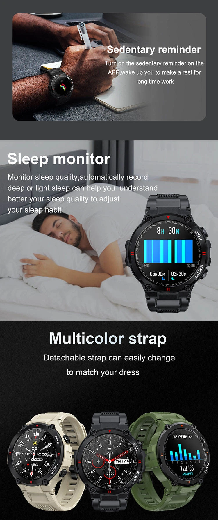 Set sedentary reminders, drink water reminders, alarm clocks, and notifications push through the app.