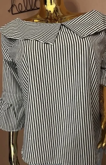 Elevate your wardrobe with this chic black-and-white striped top, perfect for adding a modern twist to classic elegance. Featuring a statement wide collar with an asymmetrical fold detail, this piece offers a unique silhouette that's both stylish and versatile. The three-quarter bell sleeves add a touch of flair, making it ideal for a polished yet playful look. Made from lightweight, breathable fabric, this top ensures comfort without compromising style.