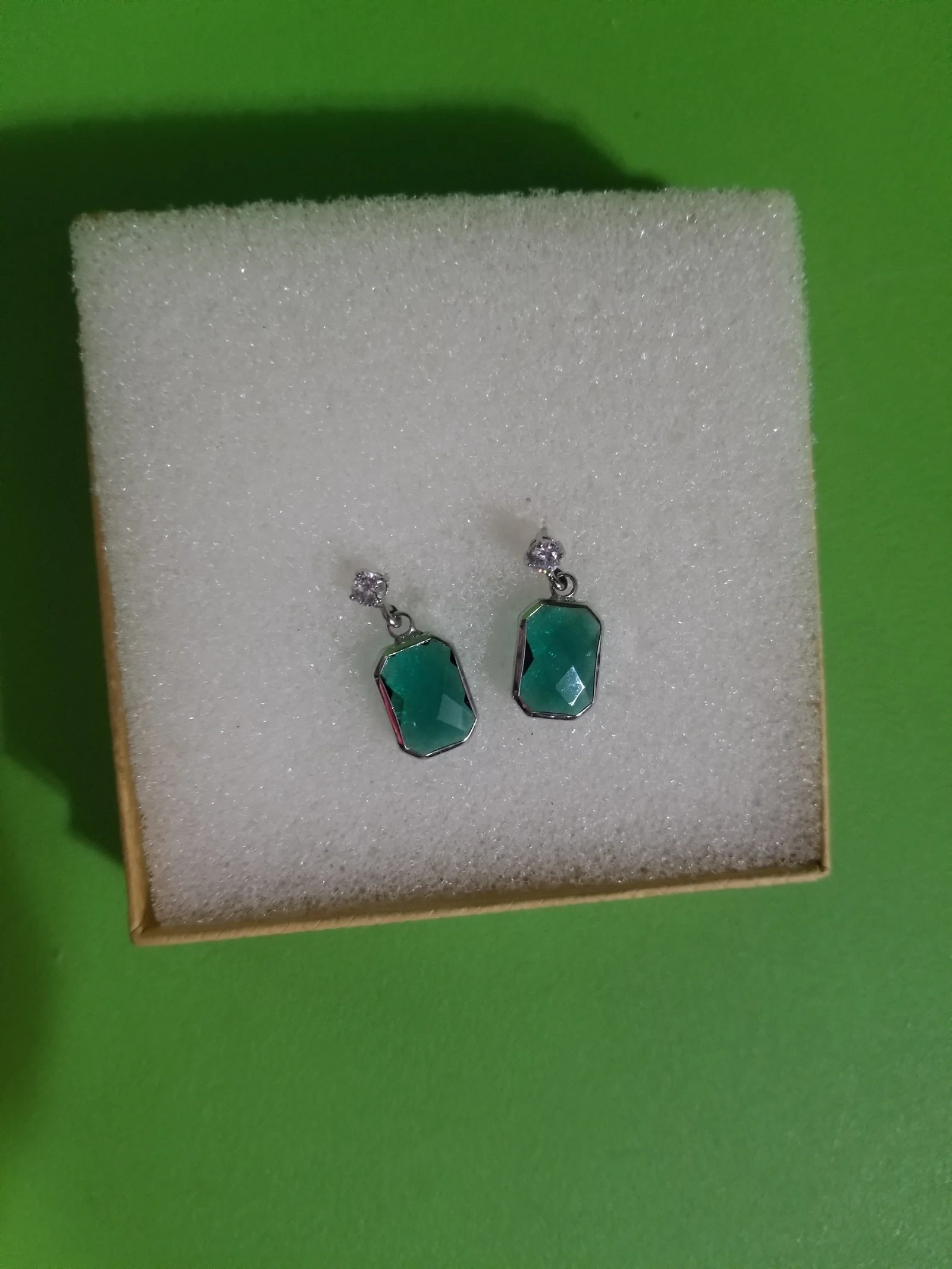 Elevate your look with these elegant emerald green gemstone drop earrings. Featuring a striking faceted green stone set in a sleek silver-tone frame, each earring is accented with a brilliant round crystal stud at the top for added sparkle. The timeless design combines modern sophistication with a hint of classic charm—perfect for evening wear, special occasions, or everyday elegance.