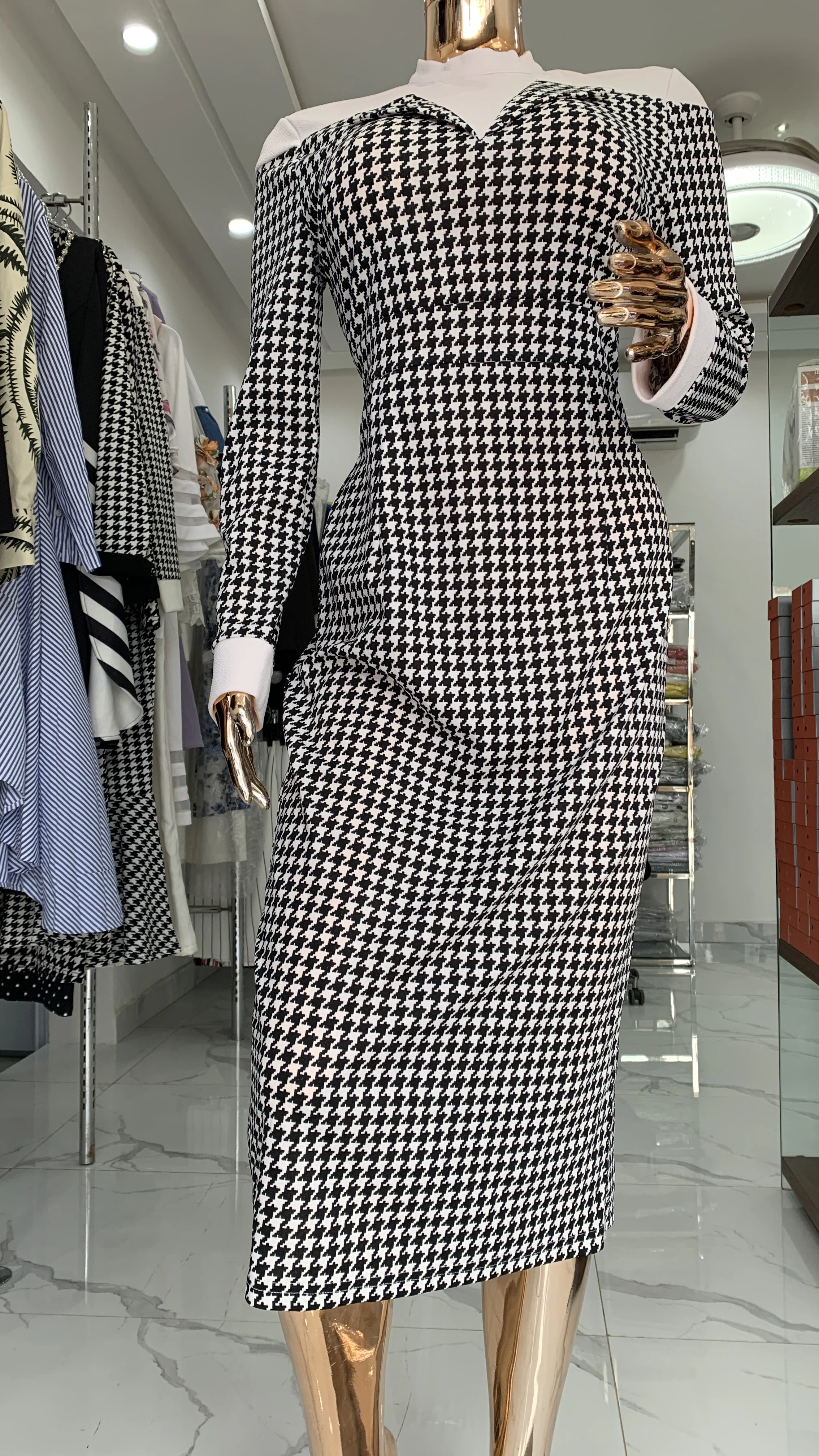 Bring bold sophistication to your wardrobe with our Houndstooth Elegance Midi Dress. This figure-flattering piece features: