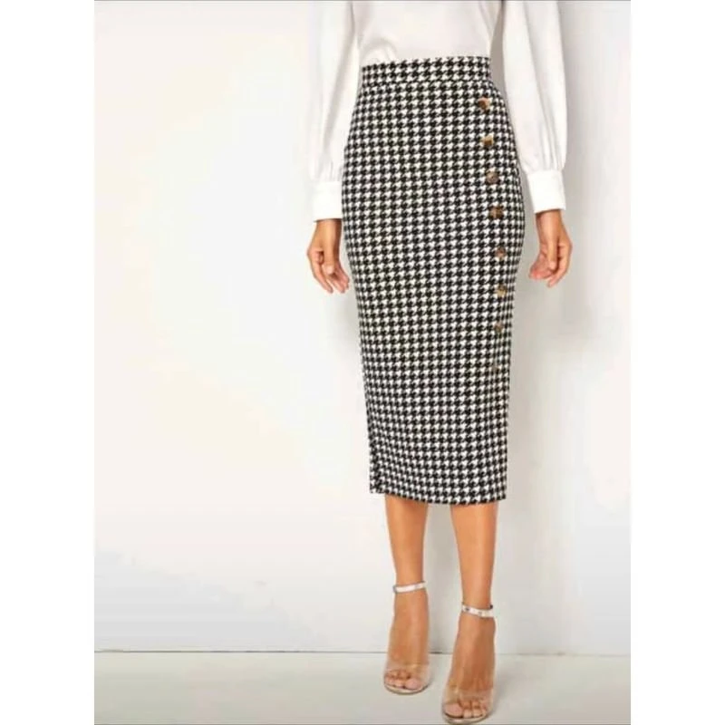 Effortlessly refined, this Houndstooth Side-Button Pencil Skirt features a classic black-and-white houndstooth pattern and a sleek high-waist midi length that hits just below the knee. The vertical row of statement buttons along one side adds subtle detailing while maintaining the clean, tailored silhouette. Perfect for the office, client meetings or a polished evening look — pair it with a crisp blouse and pumps for a timeless ensemble.