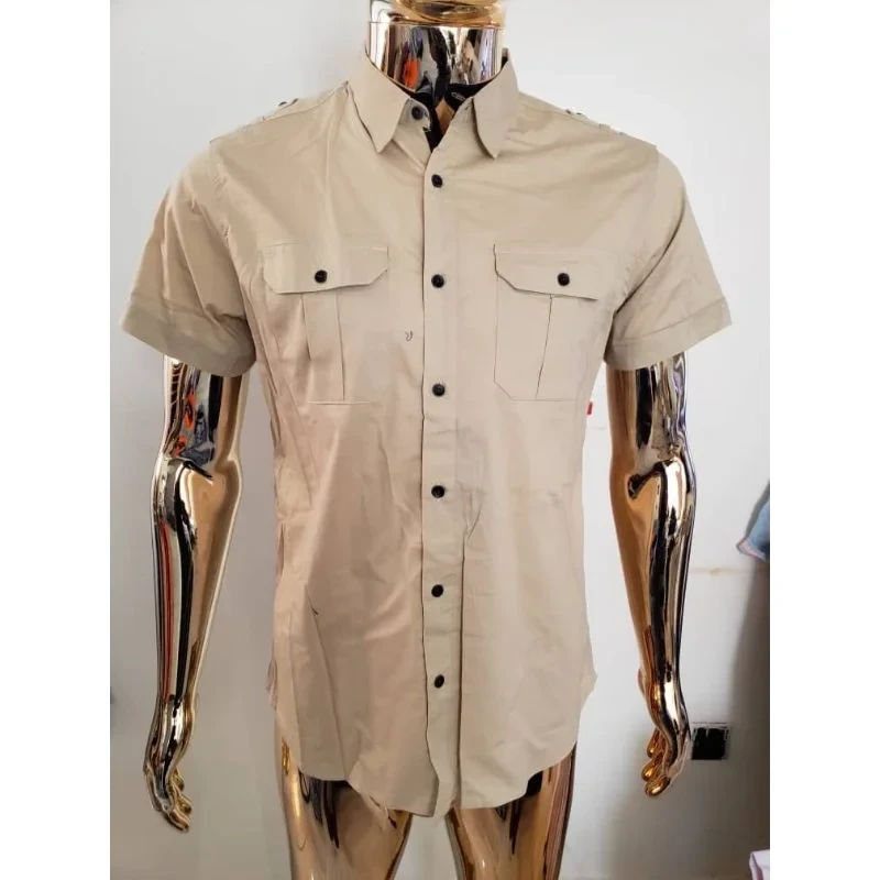 Upgrade your wardrobe with this sleek and versatile short-sleeve khaki shirt. Designed with a structured silhouette, this shirt features a button-down front, two front flap pockets with secure black buttons, and subtle pleated detailing for added style. The crisp collar and shoulder epaulettes add a touch of military-inspired flair, making it perfect for casual outings, smart-casual events, or day-to-day wear.