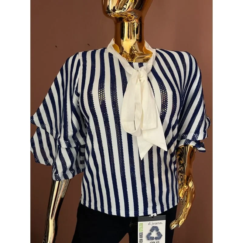 A playful mix of structure and softness—classic stripes reimagined with feminine flair.
