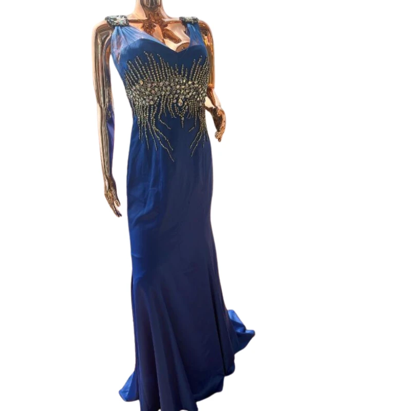 Step into the spotlight with the Royal-Empress Evening Gown, a floor-length show-stopper in regal royal blue. This gown features a sweetheart neckline and sculpted bodice adorned with intricate gold beaded detailing that radiates from the bust to the waist, creating a visually striking focal point. The sleek silhouette gently flares into a soft train, giving a graceful mermaid-inspired finish that glides effortlessly across the floor. Designed for black-tie events, gala evenings or any occasion where elegance meets bold statement, this gown pairs beautifully with gold accessories and minimalist styling to let the embellishment shine.