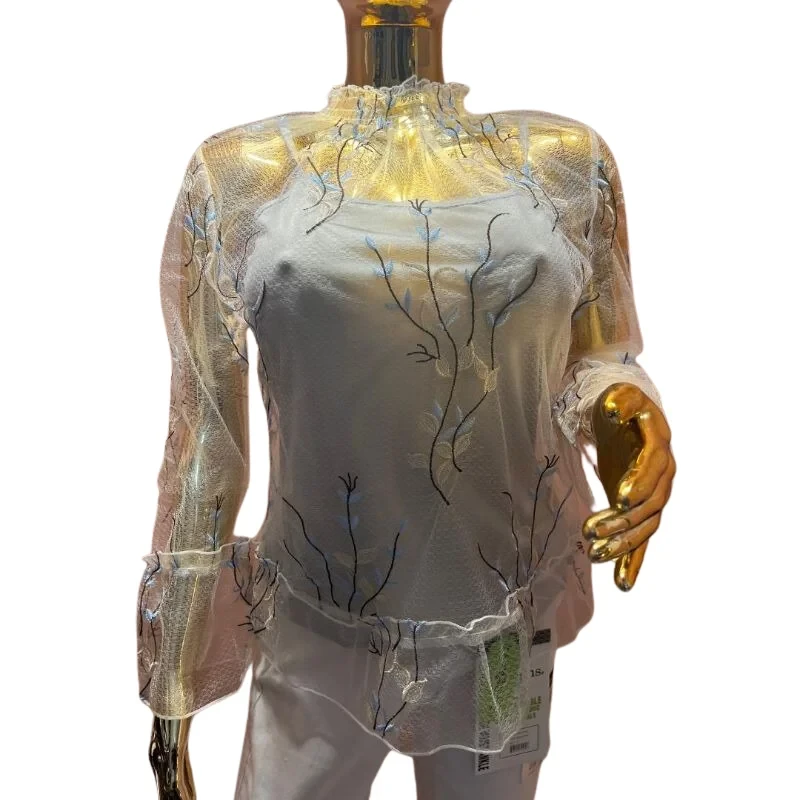 Elevate your wardrobe with this elegant sheer blouse, crafted from delicate organza fabric and adorned with intricate floral embroidery. Designed with a high ruffled neckline and subtly flared sleeves, this top effortlessly combines sophistication with a romantic flair. The lightweight, semi-transparent material adds a touch of allure, perfect for layering over a camisole or bralette.