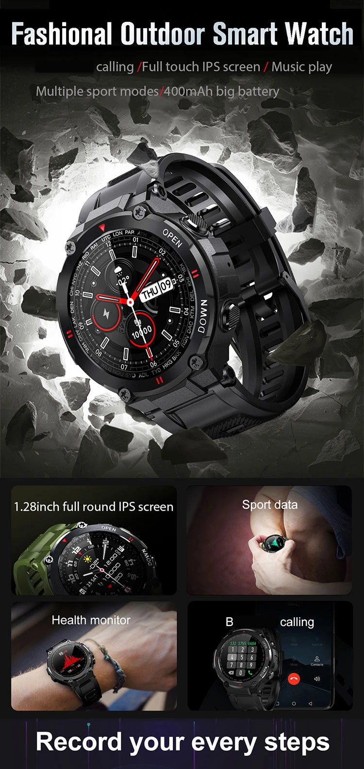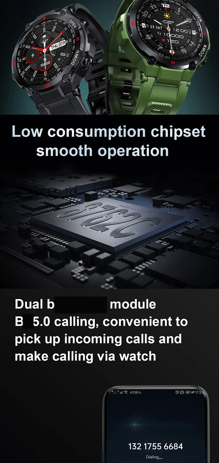 Watch Faces: Choose from 5 preloaded styles or use custom images via the app.