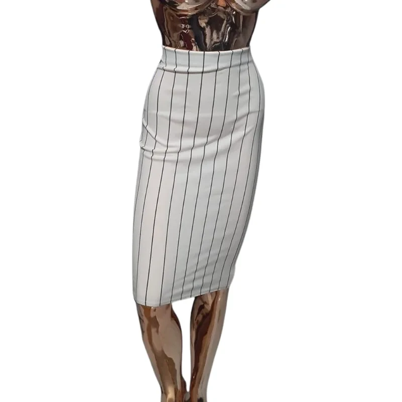 This is a classic pencil skirt with a professional and elegant appeal. It features a crisp white background with thin, vertical black pinstripes, creating a sophisticated and lengthening effect. The skirt has a high-waisted fit and a sleek, body-hugging silhouette that falls to a knee-length or midi-length cut. Made from a comfortable and likely stretchy knit or woven fabric, it is a versatile piece that can be effortlessly styled for a sharp business-casual look or a chic, casual outing.