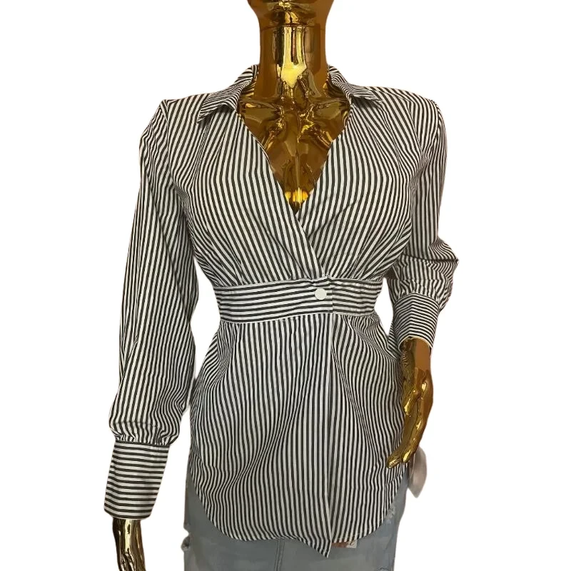 Make a polished statement with this elegant black and white striped blouse. Featuring a flattering wrap-style V-neckline and a cinched waistband with button detail, this shirt effortlessly defines the waist while adding classic charm. The long sleeves with bold cuffs provide a refined finish, perfect for both professional and semi-formal occasions.