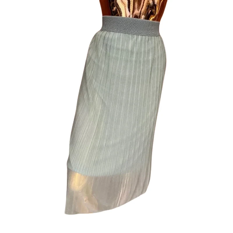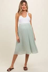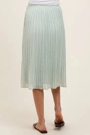 Women's elegant light sage green pleated midi skirt, featuring a shimmering metallic finish that adds a subtle glow and a comfortable elasticated waistband