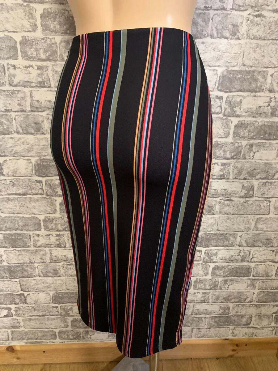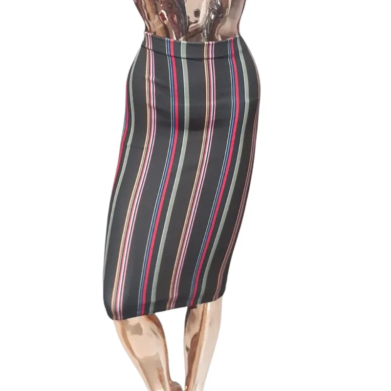 Women's fitted midi skirt. It features a stylish black base with a vibrant multi-color vertical stripe pattern in shades of red, blue, green, and white, offering a sleek and eye-catching silhouette