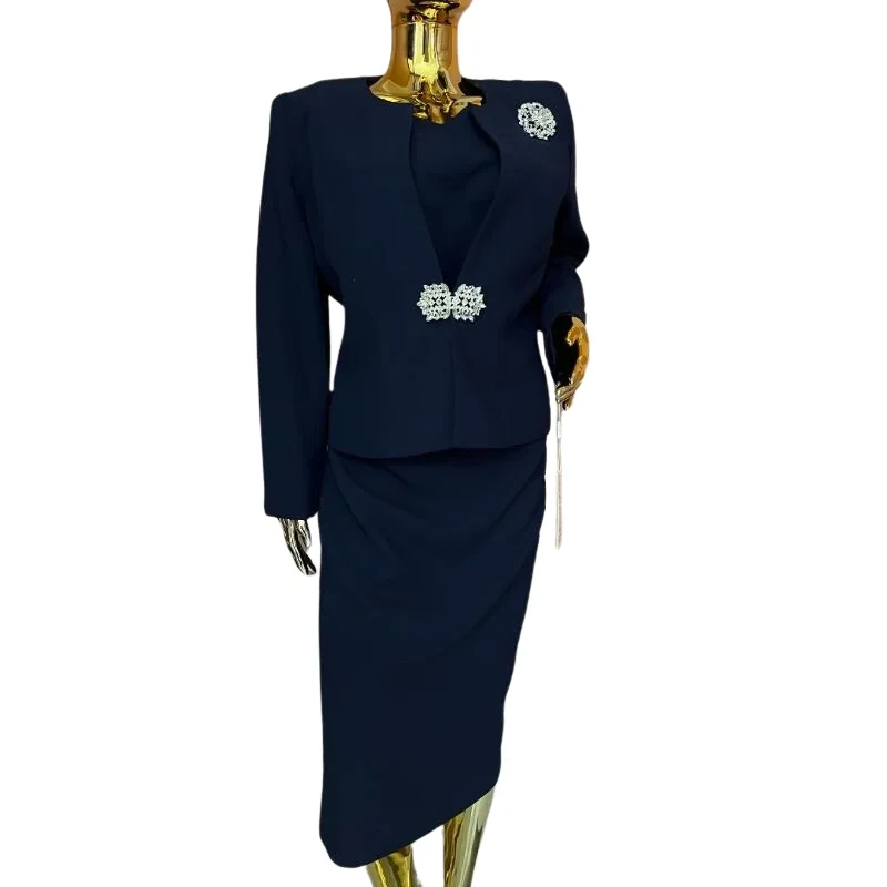 A women's elegant navy blue two-piece skirt suit, featuring a tailored long-sleeved jacket with a single decorative brooch-style clasp and a matching knee-length skirt. A complementary camisole or top is visible underneath the jacket.