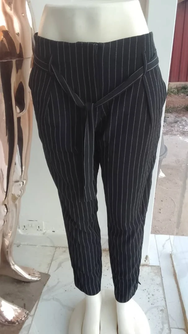 Women's black trousers. It feature a subtle white pinstripe pattern, a comfortable high-waisted fit, and a coordinating self-tie fabric belt, offering a smart and stylish silhouette.