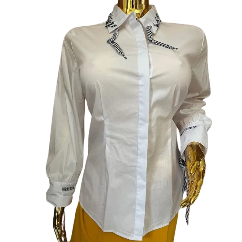 Step up your wardrobe with this elegant white long sleeve shirt, perfect for work, meetings, or elevated everyday wear. Crafted from crisp, high-quality fabric, this shirt features a tailored fit that flatters the figure. Unique black-and-white striped ribbon accents adorn the collar and cuffs, adding a modern twist to a classic look. With its button-down front and refined silhouette, this shirt pairs beautifully with trousers, skirts, or under a blazer for a polished ensemble.
